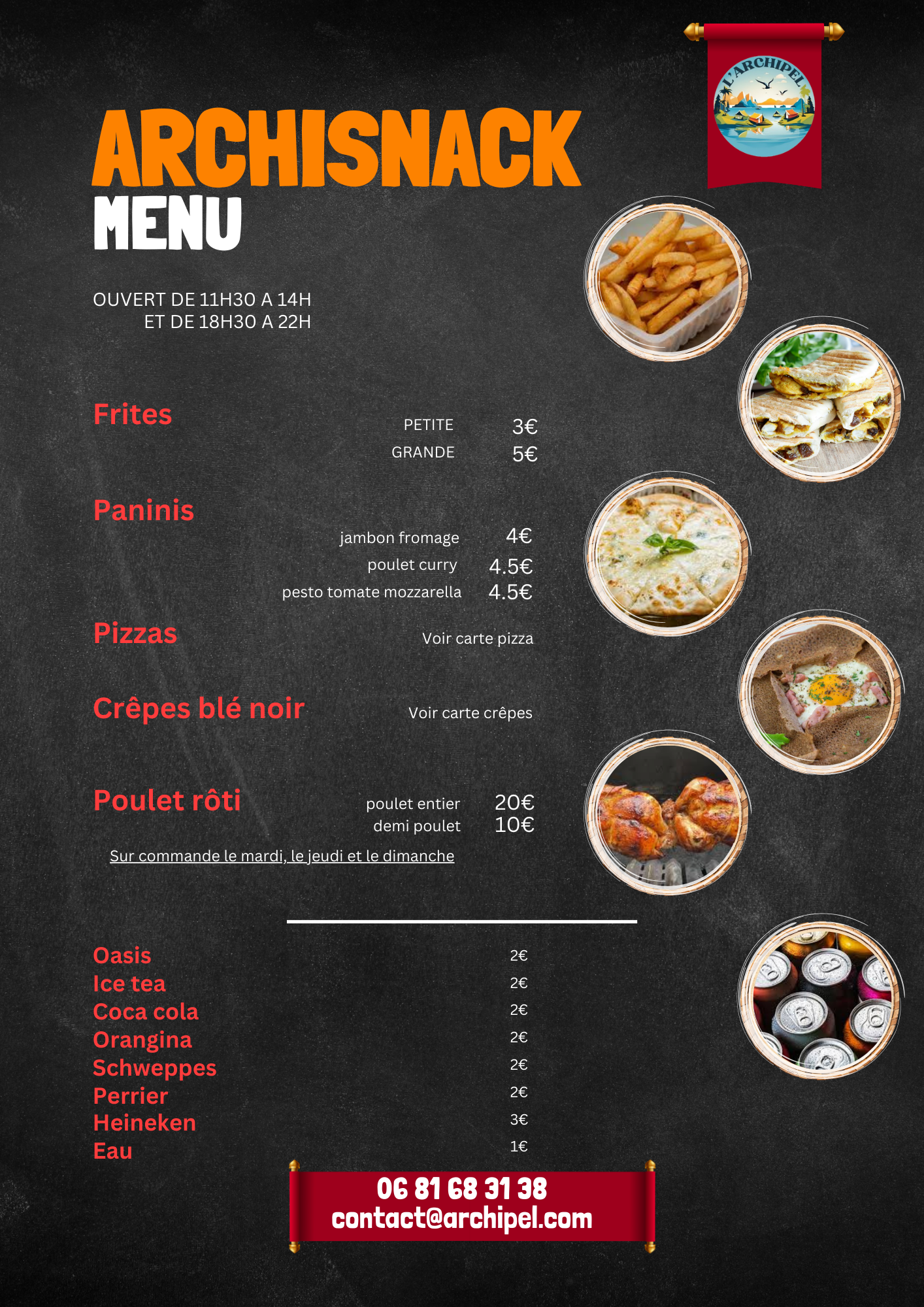 Tous nos plats sont disponibles sur commande, vous permettant de savourer vos mets préférés quand bon vous semble. Que ce soit pour un repas entre amis, une soirée tranquille à la maison ou une pause gourmande au travail, L’Archinsnack est là pour vous satisfaire.