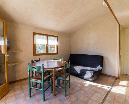 Ce chalet cosy est l’endroit idéal pour une escapade tranquille en pleine nature. Conçu pour accueillir 4 personnes, il dispose d’une chambre douillette et d’un coin nuit avec lits simples. Le salon lumineux offre un espace convivial pour se détendre après une journée d’activités. La maisonnette, bien équipée, permet de préparer de délicieux repas à partager en famille. Avec une petite terrasse extérieure, vous pourrez savourer votre café du matin tout en profitant du chant des oiseaux et de l’air frais. Ce chalet est parfait pour ceux qui recherchent une expérience authentique et simple en camping.